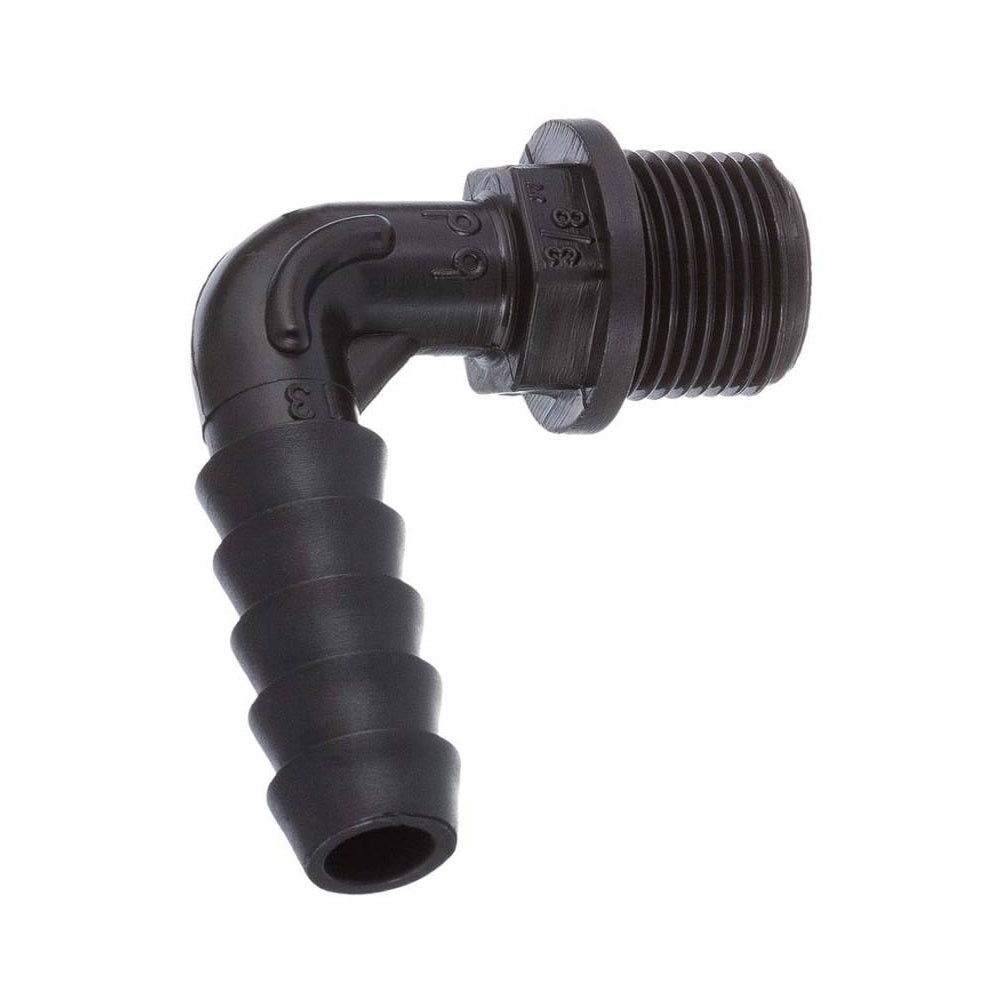 Kunststof kniekoppeling man 3/8 naar slangpilaar 12-13 mm. Voor aansluiting op de shurflo 150PSI, Flowjet, Aquatec 12-13mm slang (ID) past op deze koppeling.