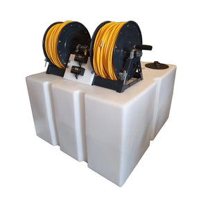 Die Haspel ist auf Lagern montiert, verfügt über eine gut einstellbare Bremse und einen Sicherungsstift, um ein zu schnelles und unerwünschtes Abwickeln des Schlauchs zu verhindern, ausgestattet mit 100 m verstärkten 8-mm-Haspelschläuchen. 2x 100PSI Pumpe 5.3, Filter, Varistreamer V16, Batterie 100AH ZAP und Batteriebox (montiert),