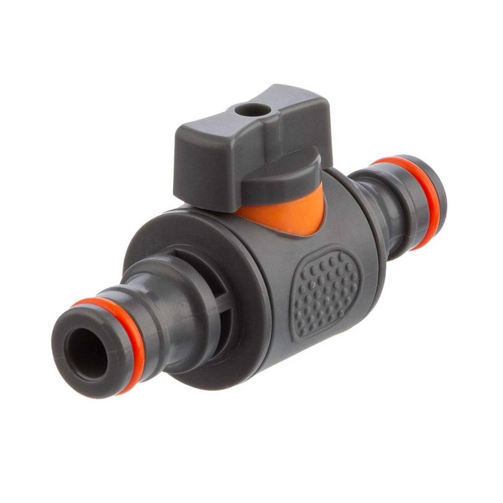 Gardena kraan, met aan beide kanten Gardena type man aansluiting.