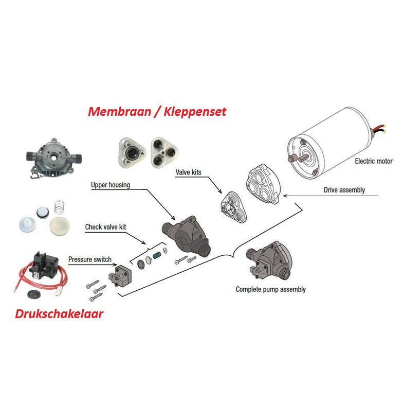 Frequently used pump for telescopic window cleaning, sufficient water output at max. flow. reliable pump, pressure switch and membrane need to be replaced every now and then, available separately.