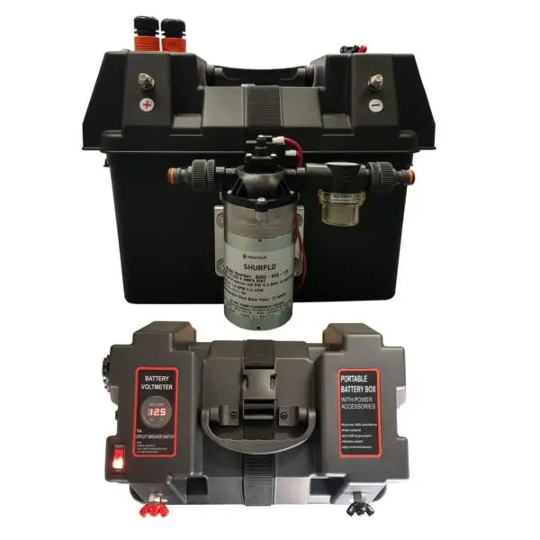 Telewash box complete with Shurflo 5.3 100psi pump with Gardena connection, integrated on/off switch and volt meter, USB connection, dirt strainer, battery terminals and hose for the water tank and reel, tested and ready to use!