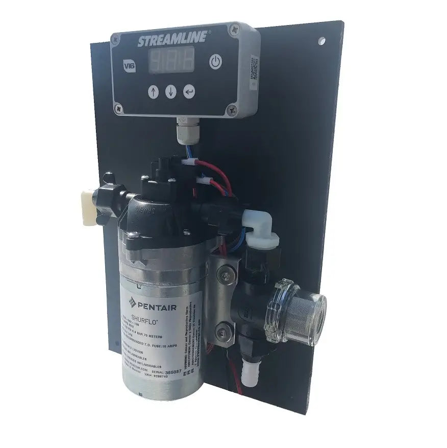 Panel with 12volt Shurflo pump 5.3, Shurflo filter couplings and Digital Varistreamer V16, incl. mounting material. Tested and ready to use.