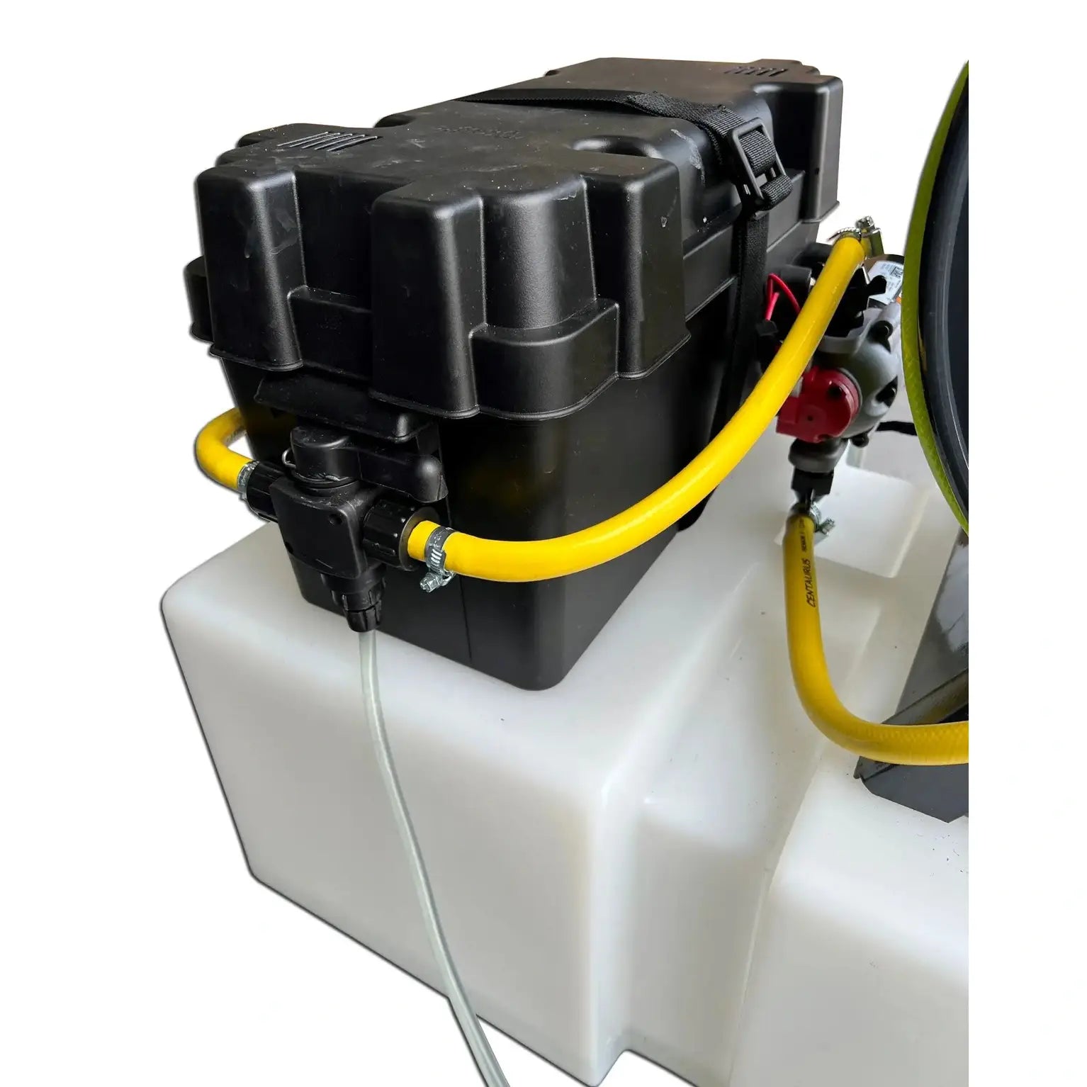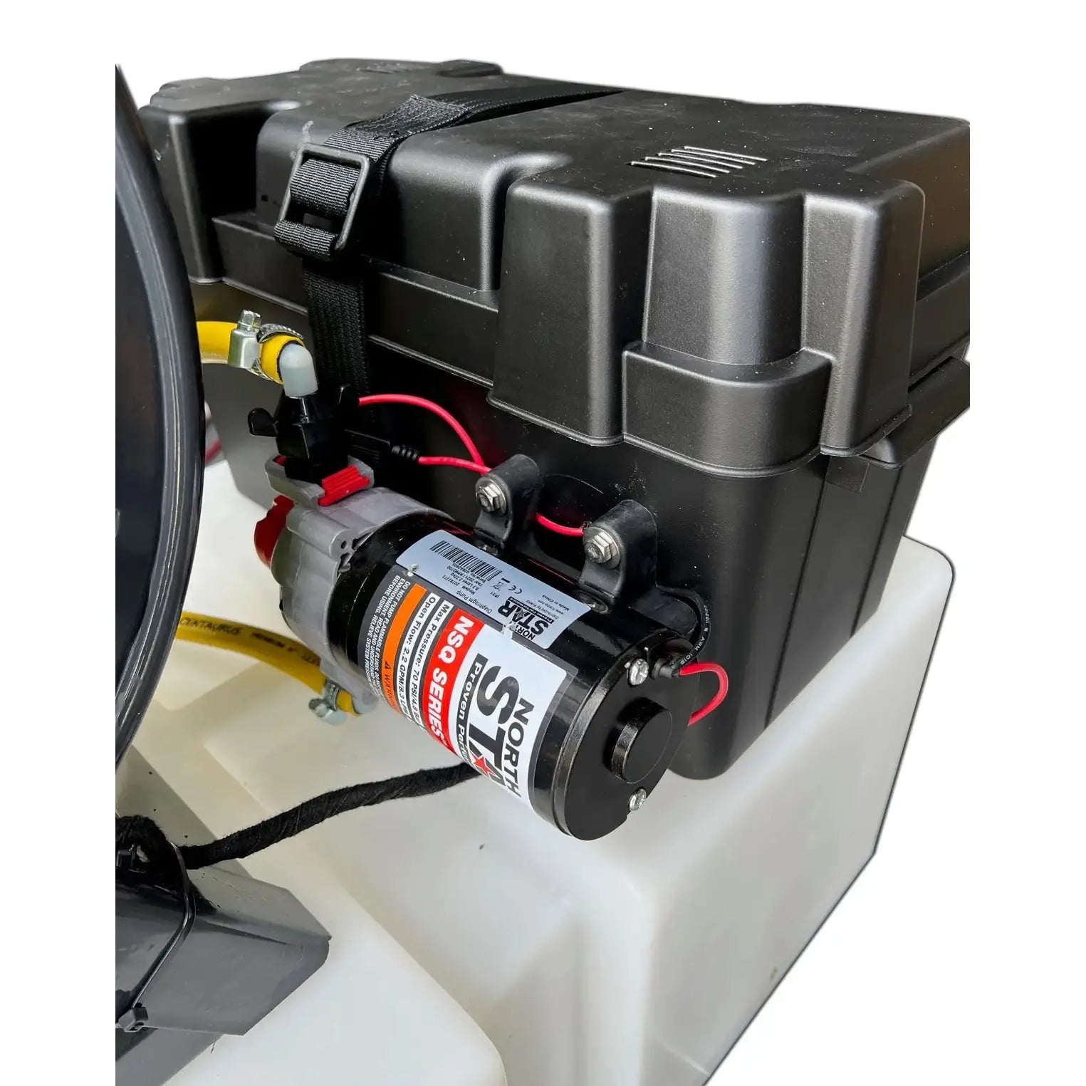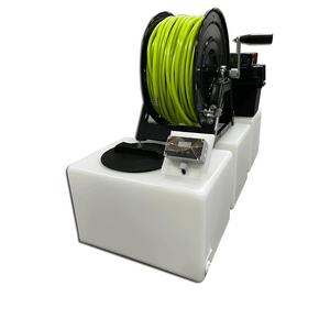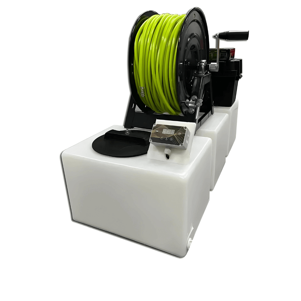 Het systeem omvat 100 meter gewapende/chemiebestendige 8mm haspelslang in een high visable kleur voor extra veiligheid, een Northstar Pomp 8.3, een filter, een V16 Varistreamer, een GREENLINE Accu 80AH, een 7A 12V acculader en een gemonteerde accubak.